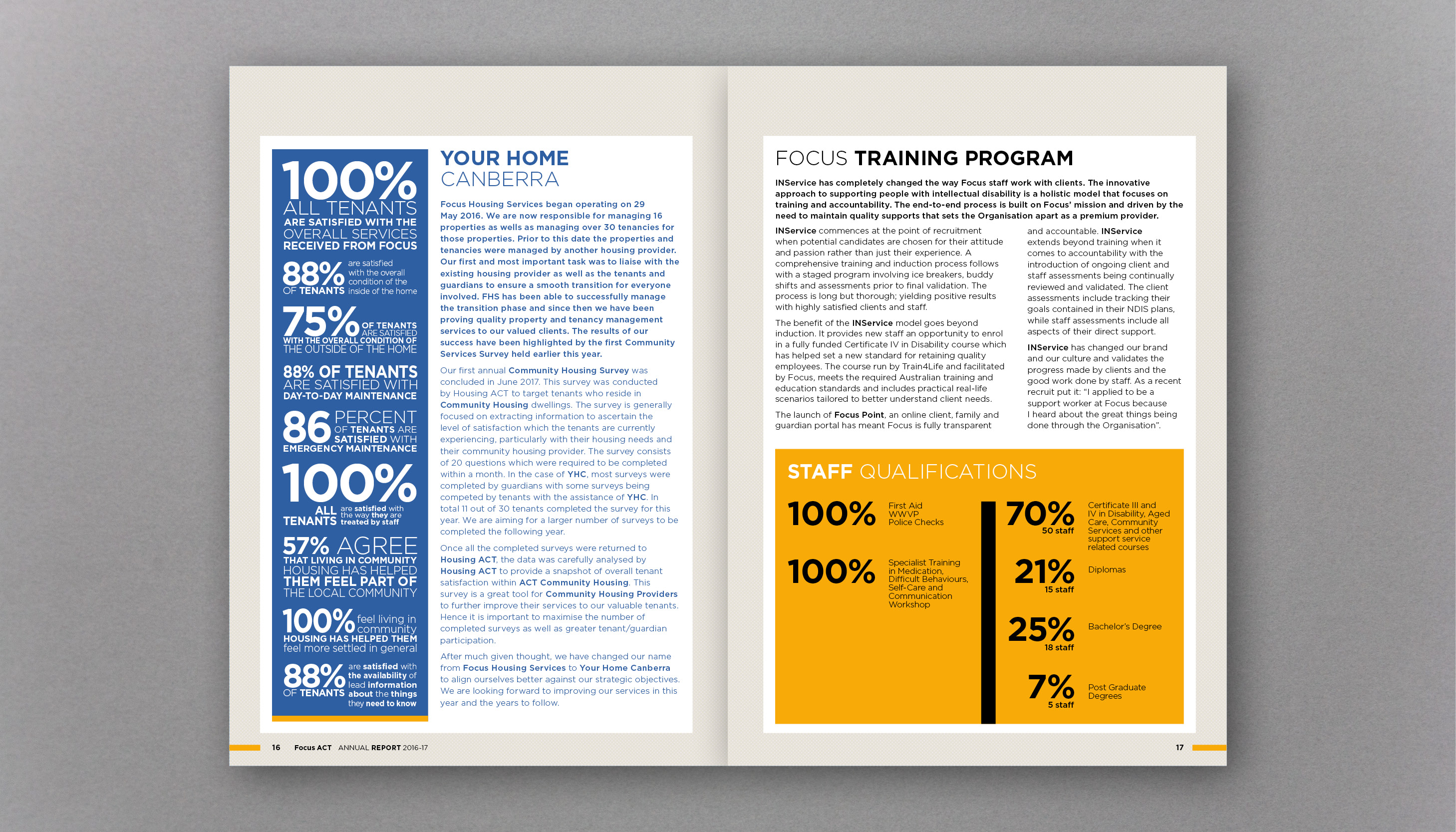 This is the second Annual Report Spectrum has produced for Focus ACT. The report’s design reflects a sophisticated perspective whilst maintaining an informal and personable approach. This parallels their business methodology with clients and carer’s. We also needed to reflect Focus’ impressive growth in recent years.